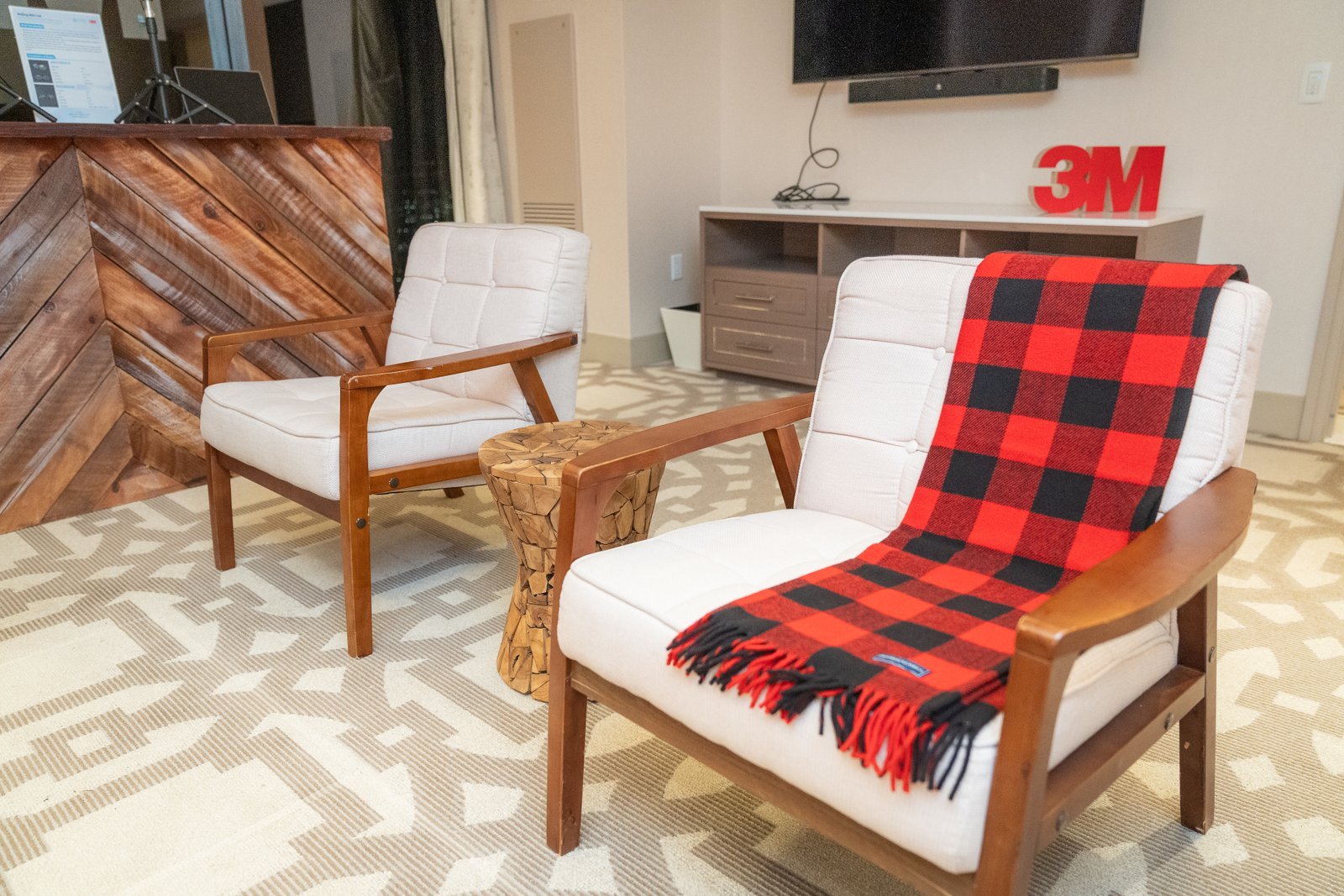 To lean into an atmosphere of comfort and connection, we designed a high-end Midwestern cabin ambiance that resonated with both the brand and the people in attendance. The space was meticulously crafted with wood furniture, buffalo check blankets, and locally sourced dried flowers, complemented by displays of local Minnesota beverages and snacks.